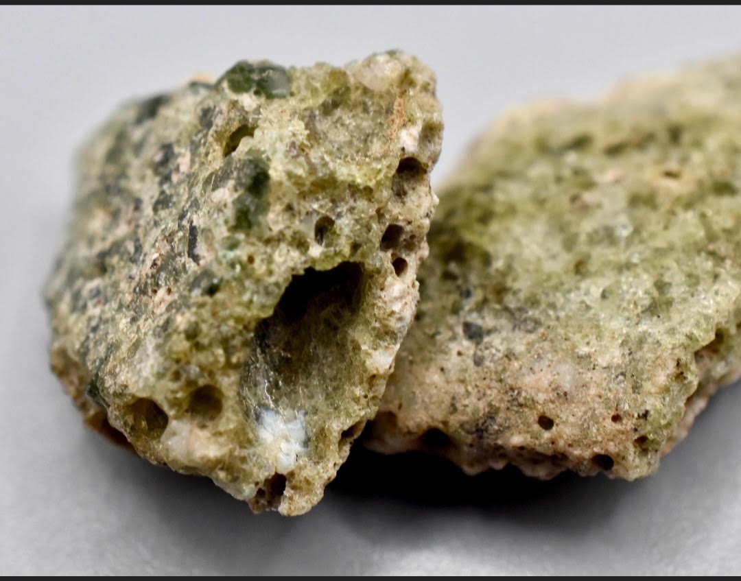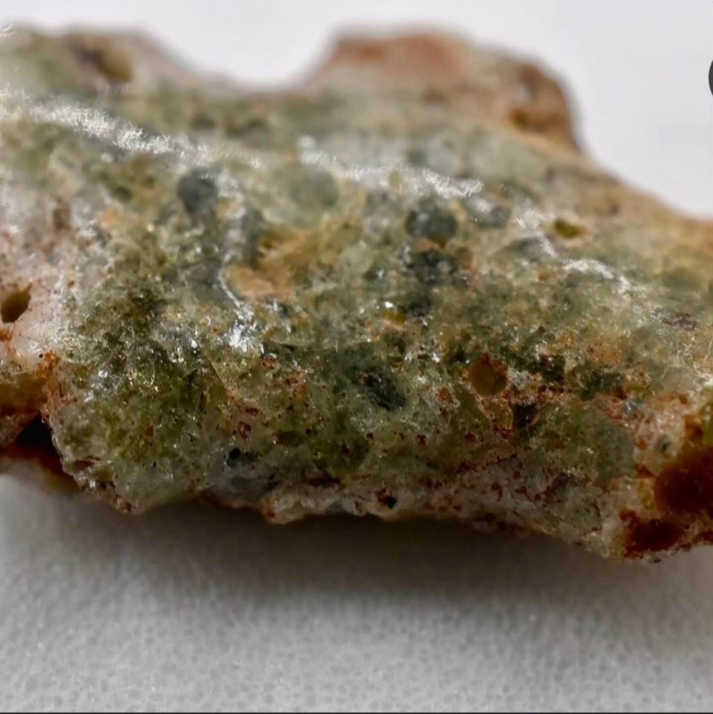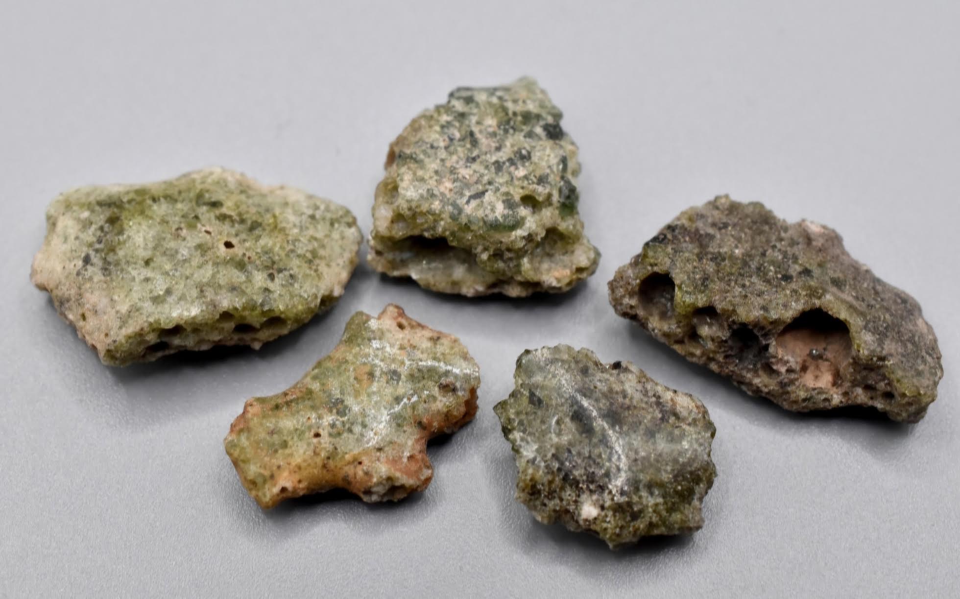 Trinitite, known as Atomic Glass, created during the first Atomic Bomb Test in July 1945 at the Trinity Site in southern New Mexico. This rock was created from the sand and other materials at the Trinity Site during the intense heat of that first atomic test. Recent studies indicate that, upon explosion, the ground was likely pushed down initially, then rebounded, forcing material into the fireball. While most trinitite is light green (due to the iron in the sand), some samples contain the iron from the tower on which the "Gadget" was detonated- those pieces look black. Other rare samples have a red tint derived from the copper from the electrical wire used in the experiment.